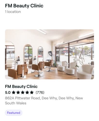 Featured Flag ListingReturn to Directory Categories BeautyDescription Your One-Stop Beauty Clinic On Northern Beaches. Address 862a Pittwater Road Dee WhyWebsite https://fmbeauty.com.au/Phone Number 0414061009Email Info@fmbeauty.com.auFacebook https://www.facebook.com/share/1HrUHHn7GY/?mibextid=wwXIfrInstagram https://www.instagram.com/p/DGO4SwESpiM/?igsh=MTg1Z28wYWp0cmxydw==Special Offers 10% off in all services for NB mums members. Use code: NBMUMS Contact listing ownerSend Message Name Email Phone Number Message